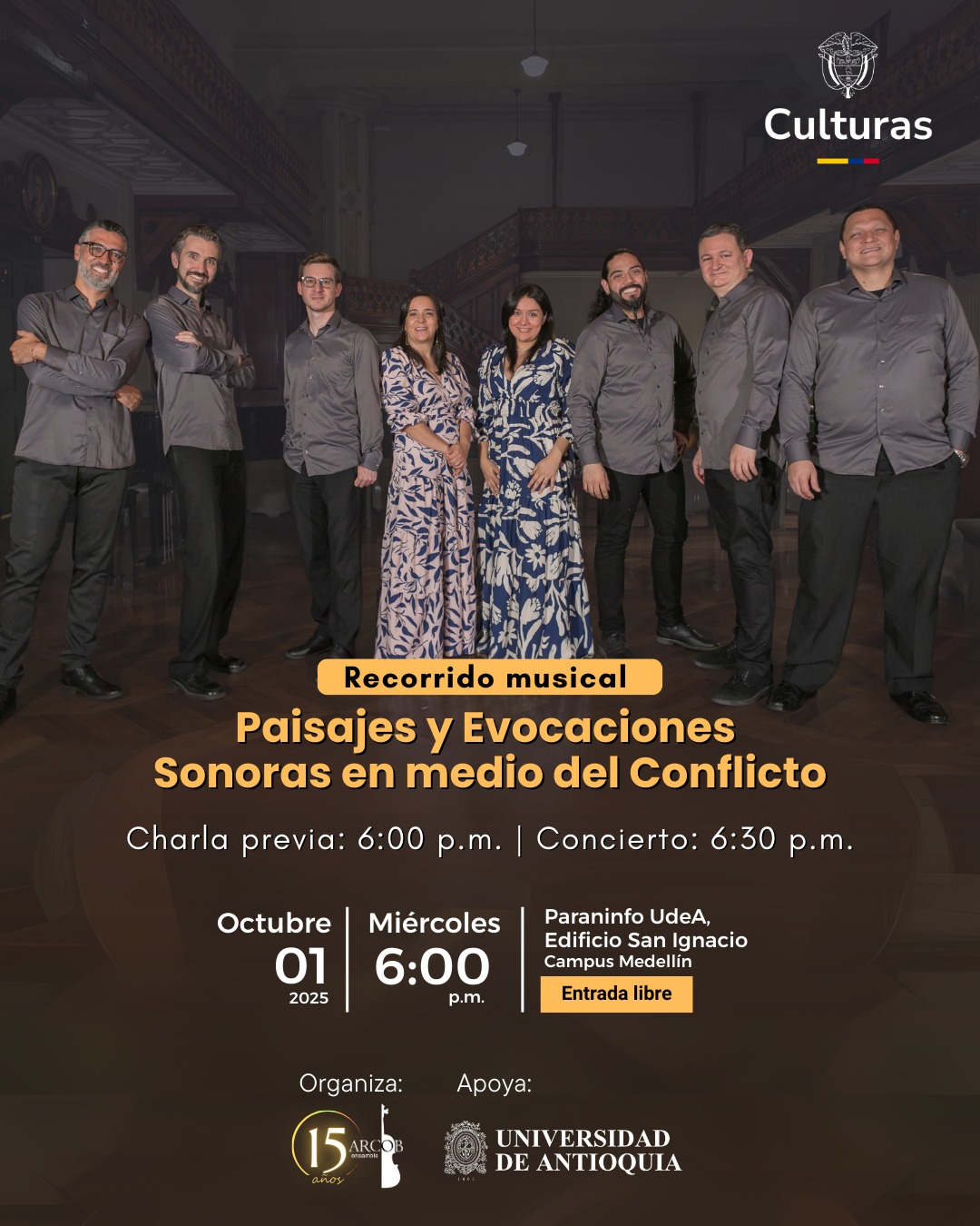 Te invitamos a un recorrido musical a través de paisajes sonoros que nos invitan a admirar las maravillas de la naturaleza, al tiempo que reflexionamos acerca de nuestro rol que como seres humanos tenemos como parte de ella y cómo el conflicto ha estado en el centro del desarrollo de nuestra historia como país y como humanidad. Este concierto hace parte de un proyecto apoyado por el Ministerio de las Culturas, las Artes y los Saberes a través de su Programa Nacional de Concertación Cultural.